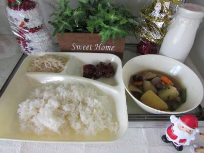 本日の給食の献立をご紹介します。本日の献立は、ご飯、くじらのオーロラ煮、じゃがいもとこんにゃくの煮物、もやしの柚子の香和え、牛乳でした。