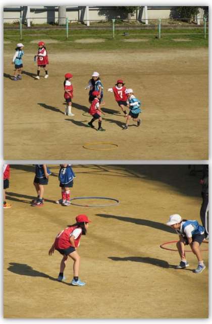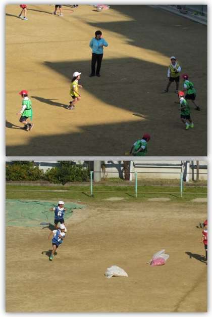 2年生の体育の学習です。運動場では、タグを腰につけ、しっぽ取りゲームをしています。