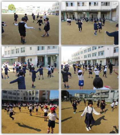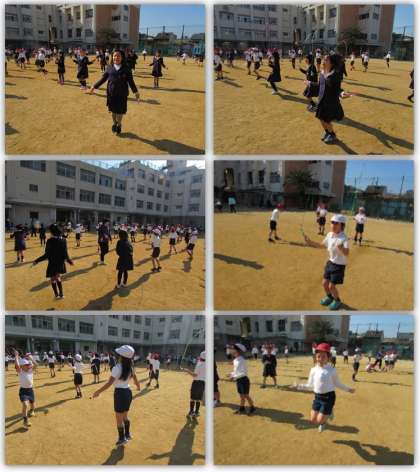 今日の『なわとびタイム』は、1・2・3年生です。前に並んだ体育委員の動きを見て、低学年もなわとびを行いました。