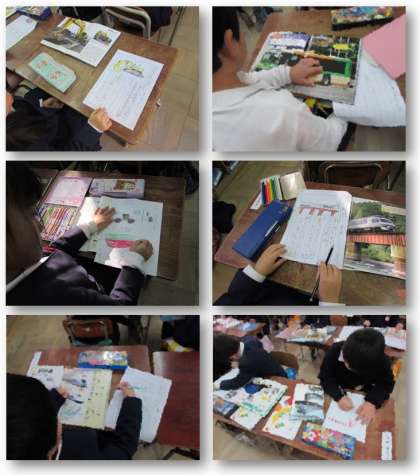 1年生の国語の学習です。本を読んで好きな乗り物について調べ、カードにまとめました。