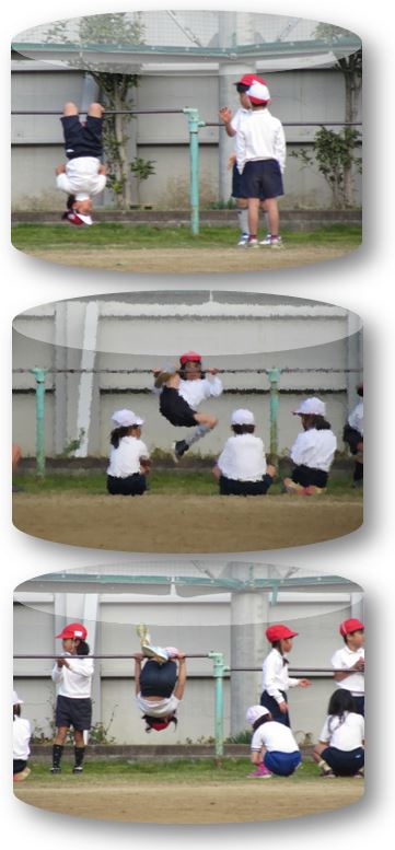 12月1日(金) 1年3組は、鉄棒運動です。ぶら下がる運動に取り組んでいます。