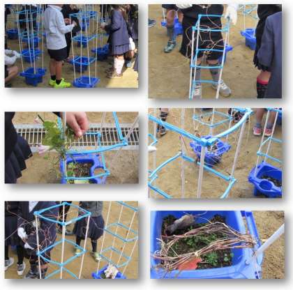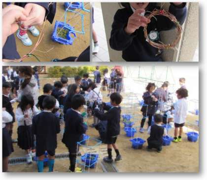1年生の生活科の学習です。育てていたアサガオのつるを抜き(まだ、葉もつるも生き生きとしていて、花が咲いているものもありましたが)、丸めてリースの台にしました。この後、いろいろな飾りをつけていきます。