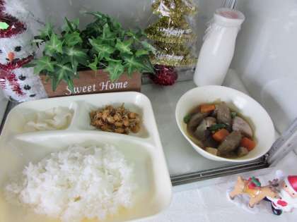 本日の給食の献立をご紹介します。本日の献立は、ご飯、鶏肉と野菜の煮物、じゃこ豆、かぶのゆず風味、牛乳でした。