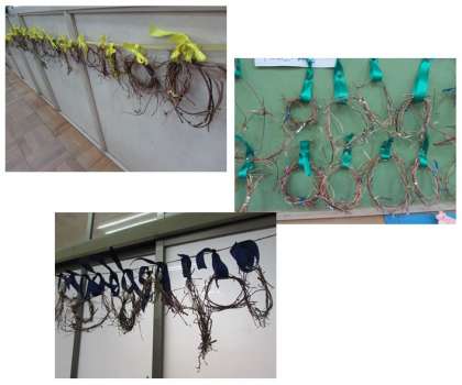 1年生は、育てたアサガオのつるを利用して、リースを作ります。先日、鉢から抜いて丸めたアサガオが、教室で吊るされています。