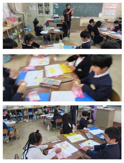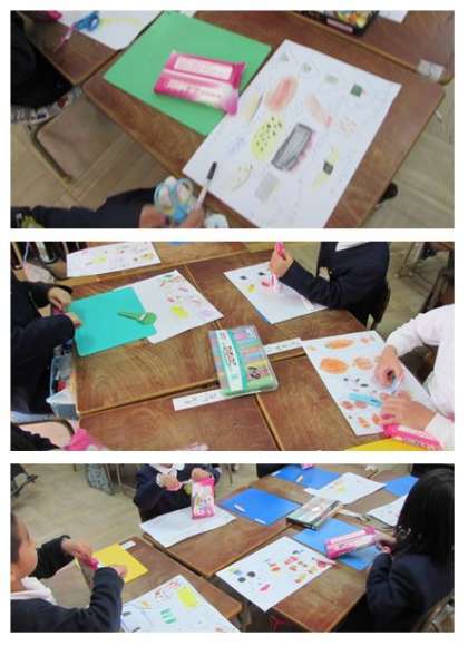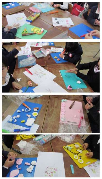 1年生の図画工作の学習です。紙粘土を使って、お弁当を作ります。自分の大好きなおかずが入った、おいしそうなお弁当を作っていきました。