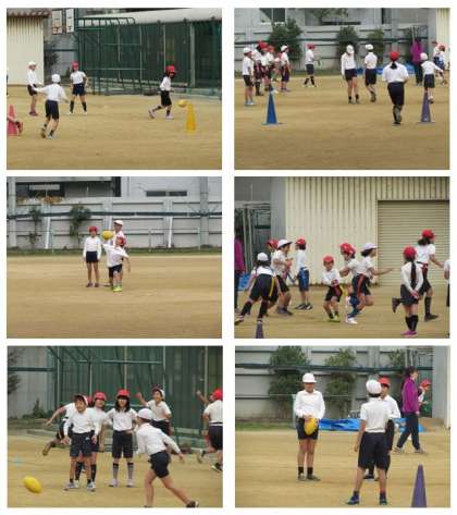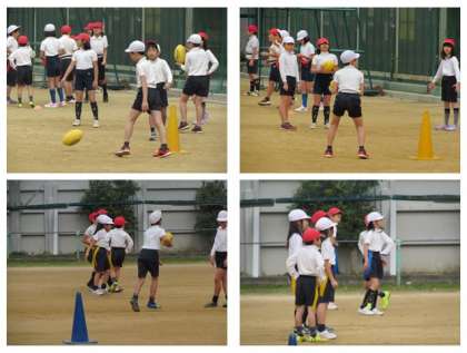 4年生の体育の学習です。タグをつけて、しっぽ取りゲームをしたり、楕円形のボールのキャッチボールをしたりして、フットボールのルールに慣れようと、練習に取り組みました。