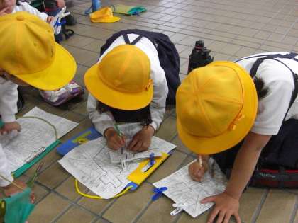 地図記号の学習をしていることもあり、「あ、お寺だ。」「しょうぼうしょがある。」など、地図記号にできる建物を見つけていくこともできました。