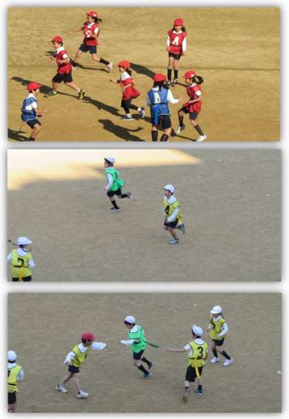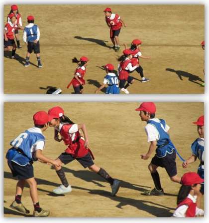縄跳びの後、タグを腰につけ、しっぽ取りを行いました。