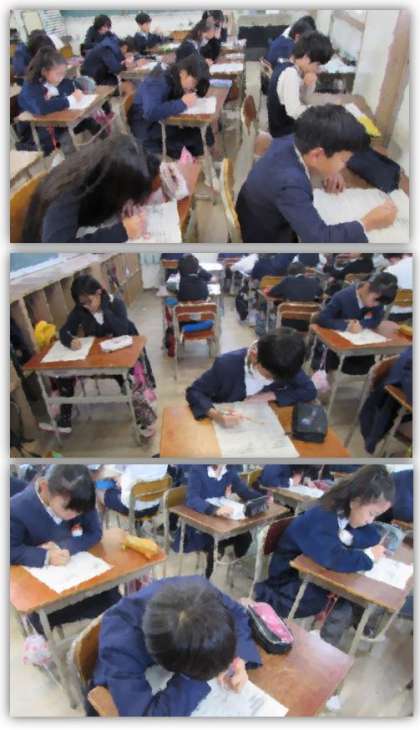 5年生の社会科の学習です。日本の工業についてのテストに取り組んでいます。大工場、中小工場、工業地帯などが問われています。