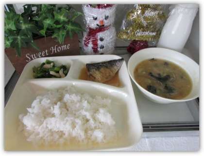 本日の給食の献立をご紹介します。本日の献立は、ご飯、牛乳、さばのみぞれかけ、みそ汁、 小松菜の炒め物でした。