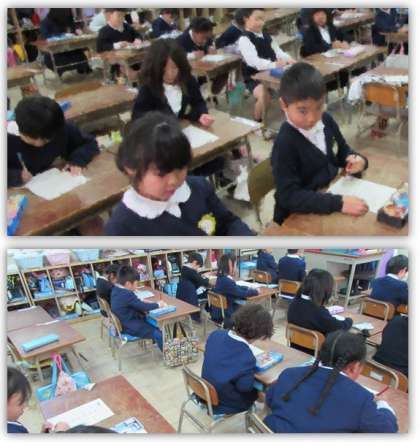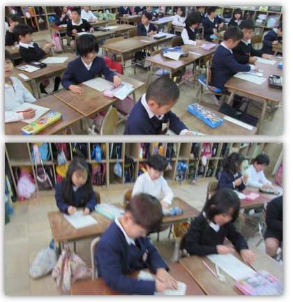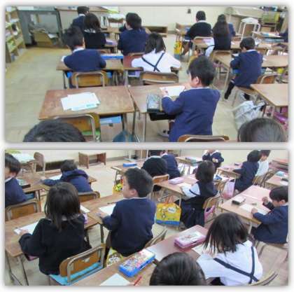 画像は、1年生の帯タイムの様子です。計算プリントに取り組んでいます。