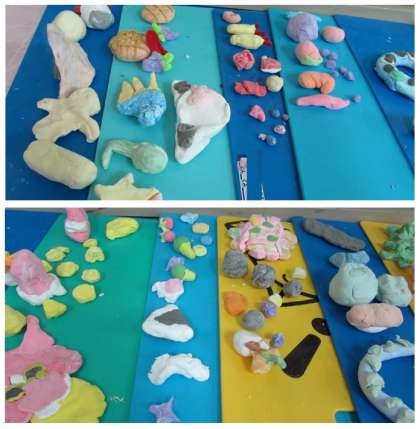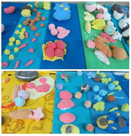 1年生が紙粘土を使って作ったお弁当の具材です。色とりどりのおかずやデザート、おにぎりなどが並んでいます。