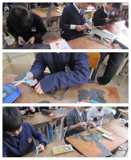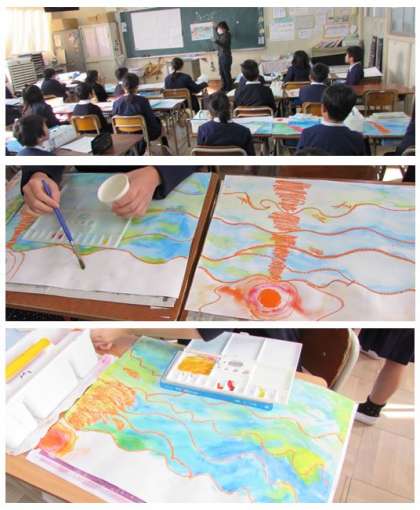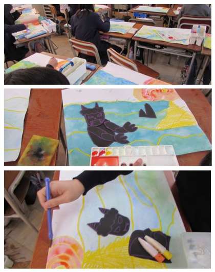 4年生の図画工作の学習です。『島引き鬼』のお話の中から、鬼が島を引いてくる場面を描いています。絵の具で彩色した背景に、画用紙を切って作った鬼を貼っていきました。