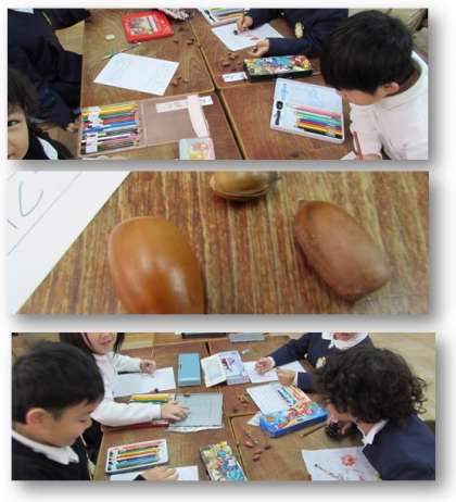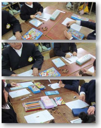 1年生の生活科の学習です。どんぐりやまつぼっくりの観察をし、カードに絵を描いたり、気づいたことを書いたりしました。