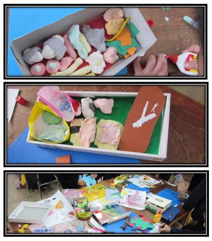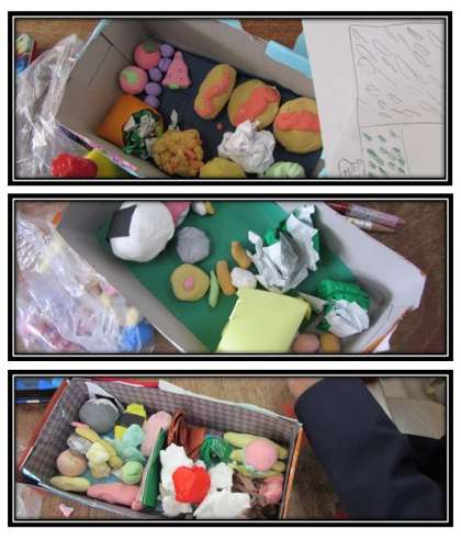 1年生の図画工作の学習です。紙粘土で作ったお弁当の具材を、お弁当箱に見立てた箱に詰めていきました。色紙で作ったサラダも並べています。