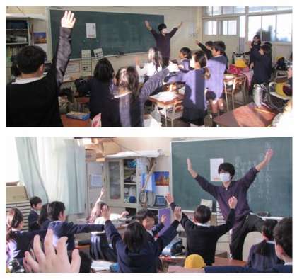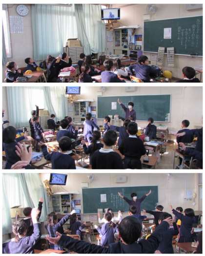 3年生のEnglish Timeの様子です。「7 ducks」に合わせて、右手を挙げ、左手を挙げ、と、順に体を動かしていきます。