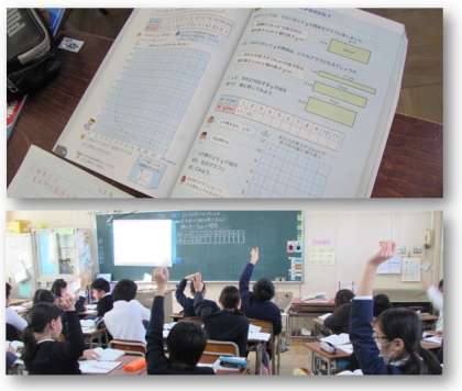 6年生の算数の学習です。「算数新発見!」を読み、面積が決まっている長方形と、周りの長さが決まっている長方形の、縦や横の長さを表したグラフを比べました。