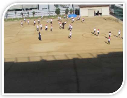1年生が体育をする3時間目、11時を過ぎると、運動場の日なたも広がってきました。それでも、運動場全体の半分くらいでしょうか。