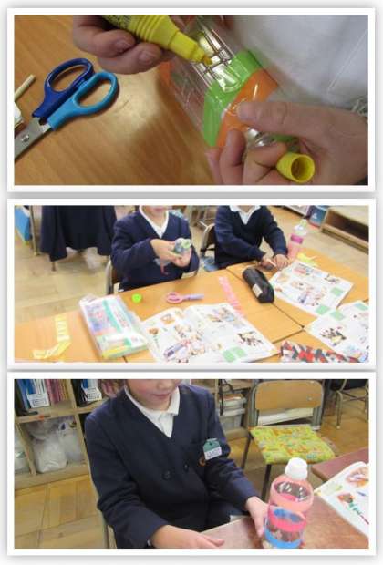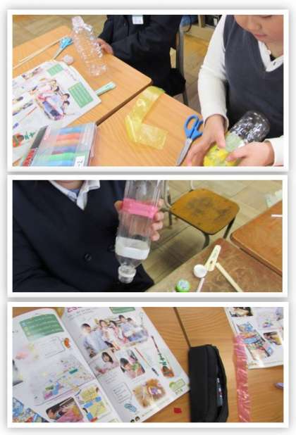 2年生の図画工作の学習です。ペットボトルやストローなど、身近な材料を使って、楽器を作ります。