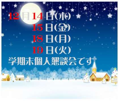 明日12月14日(木)より4日間の日程で、学期末個人懇談会を行います。短い時間ではありますが、2学期の学習や学校生活の様子をふり返り、今後、めあてを持てるような、そんなお話ができればと考えています。どうぞよろしくお願いいたします。