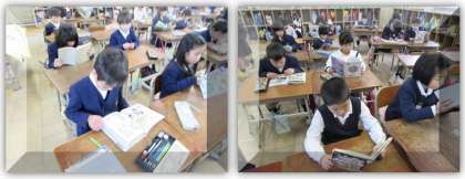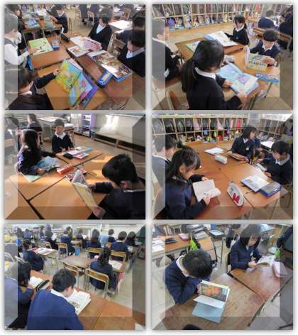水曜日の朝は読書タイムから始まります。千本小学校の子どもたちは、各自が1冊本を選び、15分間、読書をしています。