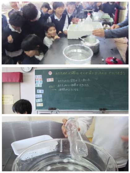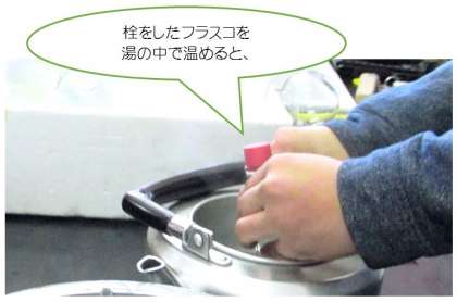 4年生の理科の学習です。空の丸底フラスコに栓をした状態で、湯につけると、栓が飛び出しました。なぜ栓が飛び出したのだろう…子どもたちは栓を押し出したもの=空気と、温度との関係について考えました。