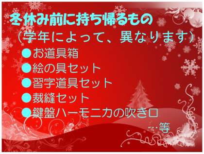 今週、そして来週で、それぞれ学習用具を持ち帰ります。一度にたくさんにならないよう、順次持ち帰りますので、持ち帰りましたら中身の点検、また補充をお願いいたします。