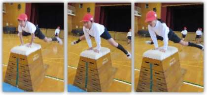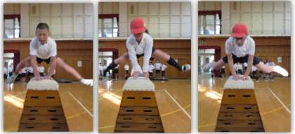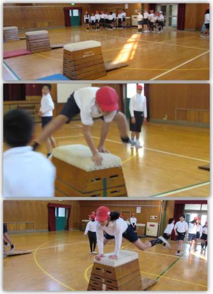 5年生の体育の学習です。跳び箱で、開脚跳びに取り組みました。