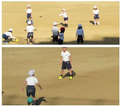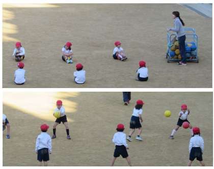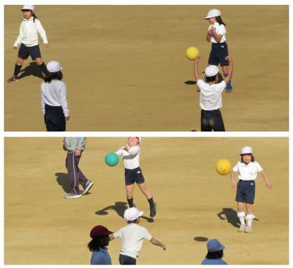 1年生の体育の学習です。運動場で、ドッジボールを使って投げたり受けたりする運動です。