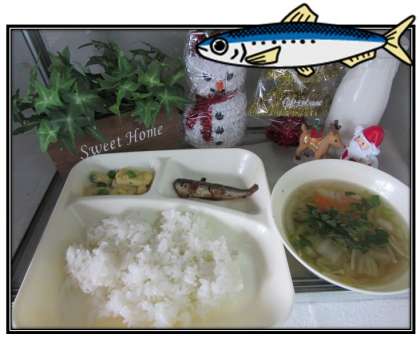 本日の給食の献立をご紹介します。本日の献立は、ご飯、いわしの生姜煮、うすくず汁、高野豆腐の卵とじ、牛乳でした。