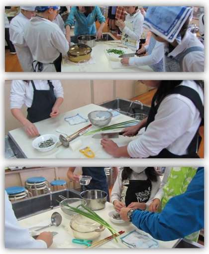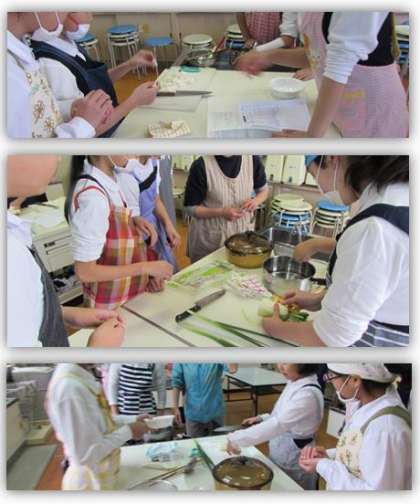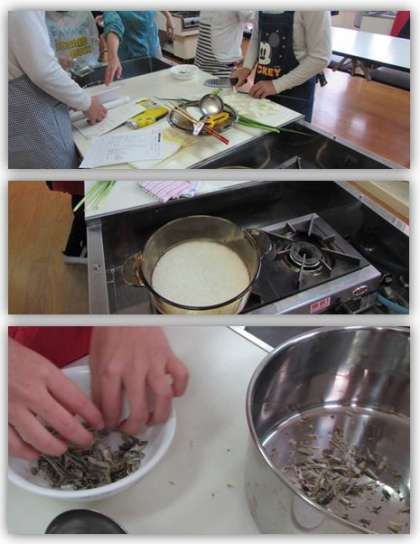 5年生の家庭科の学習です。今日は、調理実習を行いました。ご飯を炊き、お味噌汁を作りました。班で分担して、野菜を切り、にぼしのはらわたを取り、お米を研ぎました。