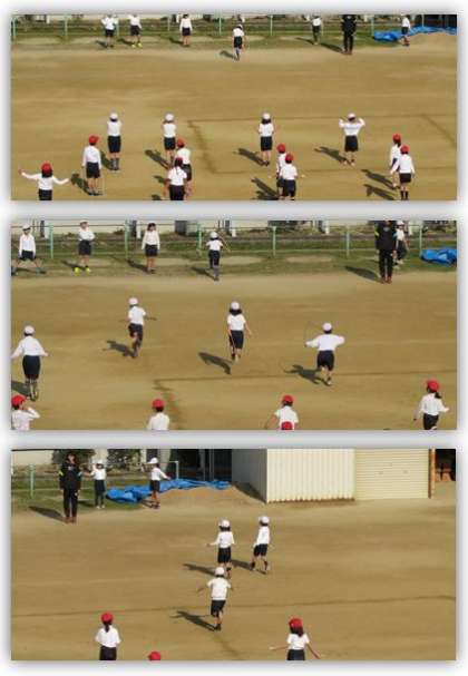 1年生の体育の学習です。運動場で縄跳びをしました。画像は、駆け足跳びを行っている場面です。