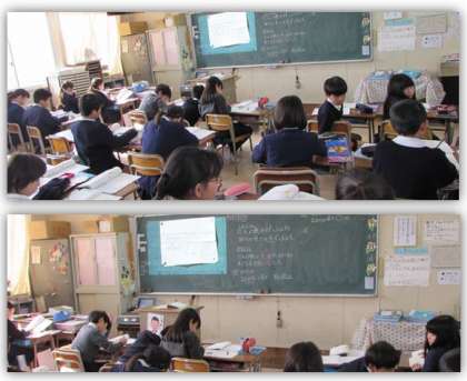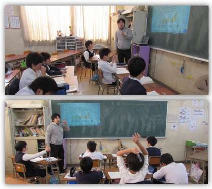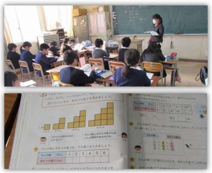 4年生の算数の学習です。1辺が1cmの正方形を階段状に並べたときの、段の数と周りの長さの関係を調べました。そして、表に段の数と周りの長さをまとめ、その関係を式に表しました。式を用いることで、段の数が50段のときの周りの長さや、周りの長さが60cmのときの段の数をそれぞれ求めることができました。