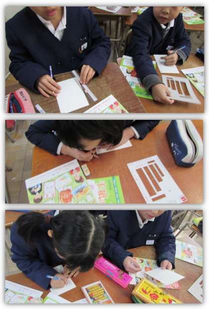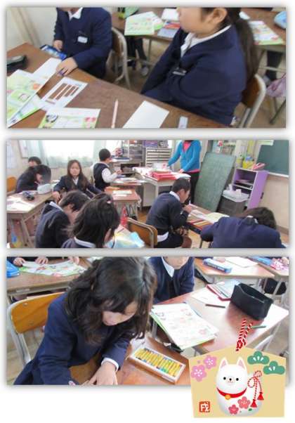 3年生の国語の学習です。お手本を参考にしながら、年賀状を書いています。「お兄ちゃんに」「おばあちゃんに」「友達に」と、出す相手のことを考えながら、書いていきました。