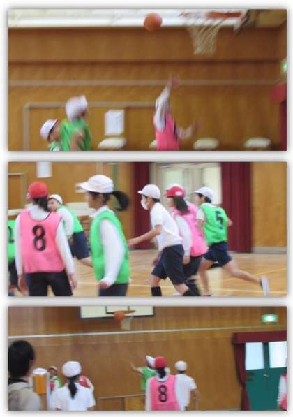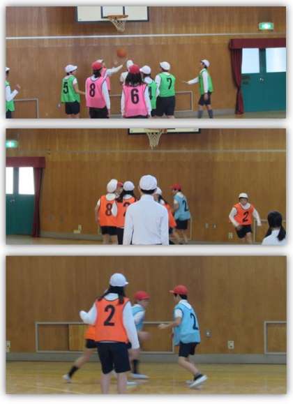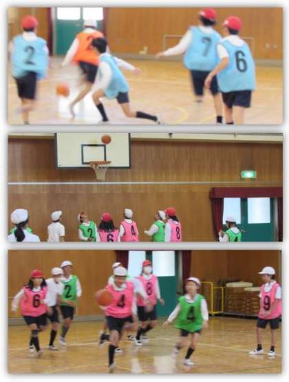 6年生の体育の学習です。チームに分かれ、バスケットボールの試合を行いました。