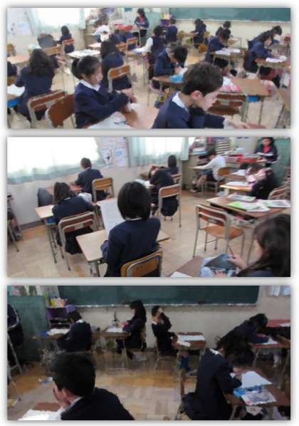3年生の算数の学習です。分数のテストに取り組んでいます。分数の意味や表し方、分数のたし算、ひき算の設問がありました。