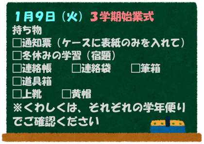 1月9日(火)、3学期始業式です。忘れ物の無いよう、ご準備ください。