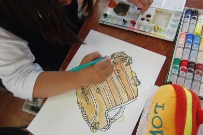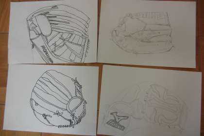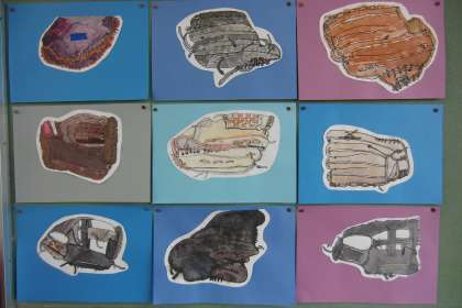 6年生の図工の学習「グローブを描こう」です。よく観察し、細かい部分もしっかりと描いていきます。グローブの色は、赤・黄・青・黒の4色を使って、作りました。使い込んだグローブの色合いも表現できています。