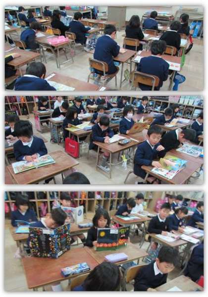 画像は、1年生の様子です。自分で選んだ本を、子どもたちは読んでいます。