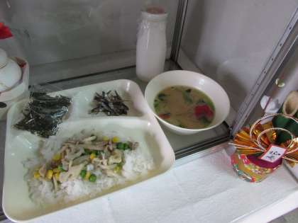 本日の給食の献立をご紹介します。本日の献立は、れんこんのちらし寿司、雑煮、ごまめ、牛乳でした。