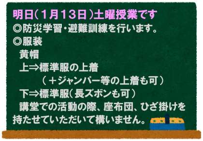 明日1月13日(土)は3学期1回目の土曜授業です。防災学習・避難訓練を行います。保護者の皆様も、どうぞご参会ください。