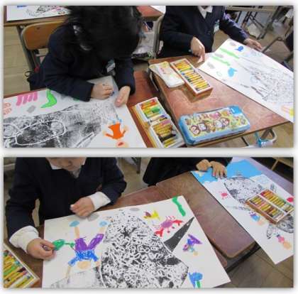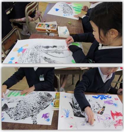 2年生の図画工作の学習です。紙版画で表現した海の生き物の周りに、パスで描き足していきました。海の中はどうなっているのかな。子どもたちは想像しながら、パスで塗り込んでいきました。