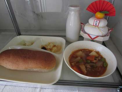 本日の給食の献立をご紹介します。本日の献立は、ライ麦パン、鶏肉と野菜のケチャップ煮、カリフラワーとコーンのサラダ、桃のクラフティ、牛乳でした。