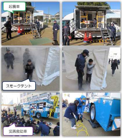 運動場では、起震車、スモークテントの体験や、災害救助車についての学習を行いました。