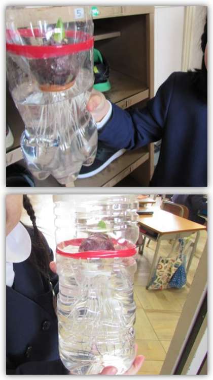 2年生は生活科の学習で、ヒヤシンスの水栽培を行っています。今日も水替えをしていて、観察すると、根が大きく伸びていることに気づきました。