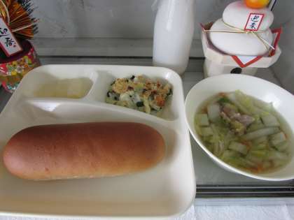 本日の給食の献立をご紹介します。本日の献立は、黒糖パン、ほたて貝のグラタン、スープ、和梨の缶詰、牛乳でした。