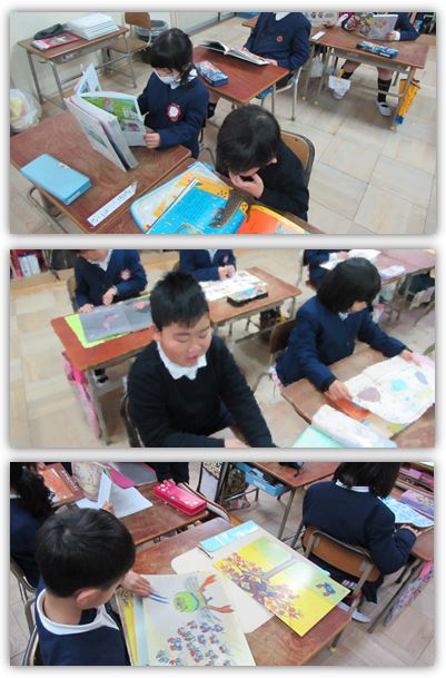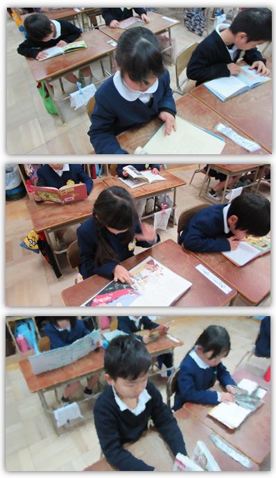 画像は、読書タイムの1年生です。自分で選んだ本を、静かに読んでいます。