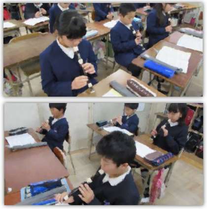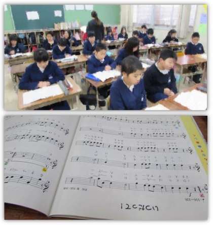 4年生の音楽の学習です。『いつだって!』という曲を歌いました。また、『チキチキバンバン』のリコーダーパートの練習にも取り組みました。