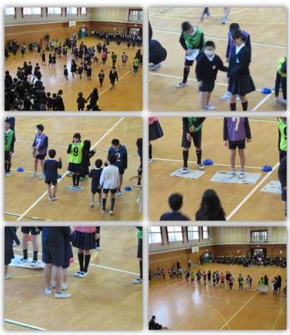 本日は、集会委員会による『新聞じゃんけんリレー』です。班のリーダーが新聞紙の上に乗り、各班のメンバーはペアでリーダーのところに行って、じゃんけんをします。リーダーが負けると、新聞紙を半分に折っていきます。新聞紙はどんどん小さくなっていきましたが、リーダーたちは何とか落ちないように頑張っていました。