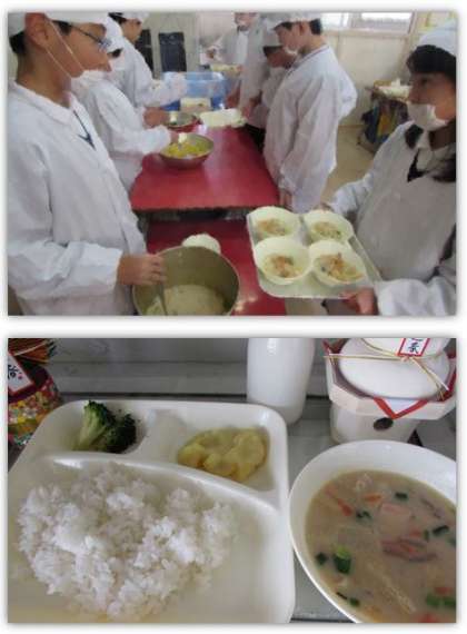 本日の給食の献立をご紹介します。本日の献立は、ご飯、かす汁、ブロッコリーの胡麻和え、くりきんとん、牛乳でした。
